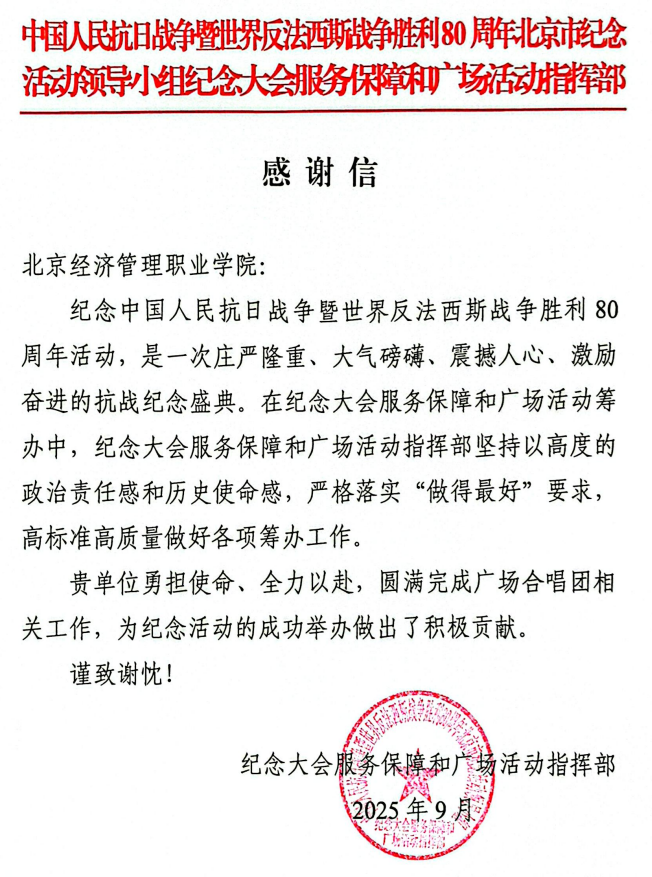 近日,bat365在线平台收到来自中国人民抗日战争暨世界反法西斯战争胜利80周年北京市纪念活动领…