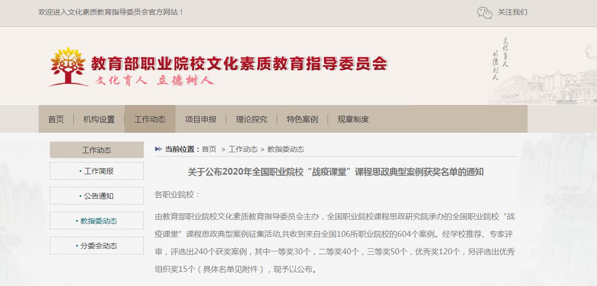 教育部职业院校文化素质教指委近日公布2020年全国职业院校“战疫课堂”课程思政典型…