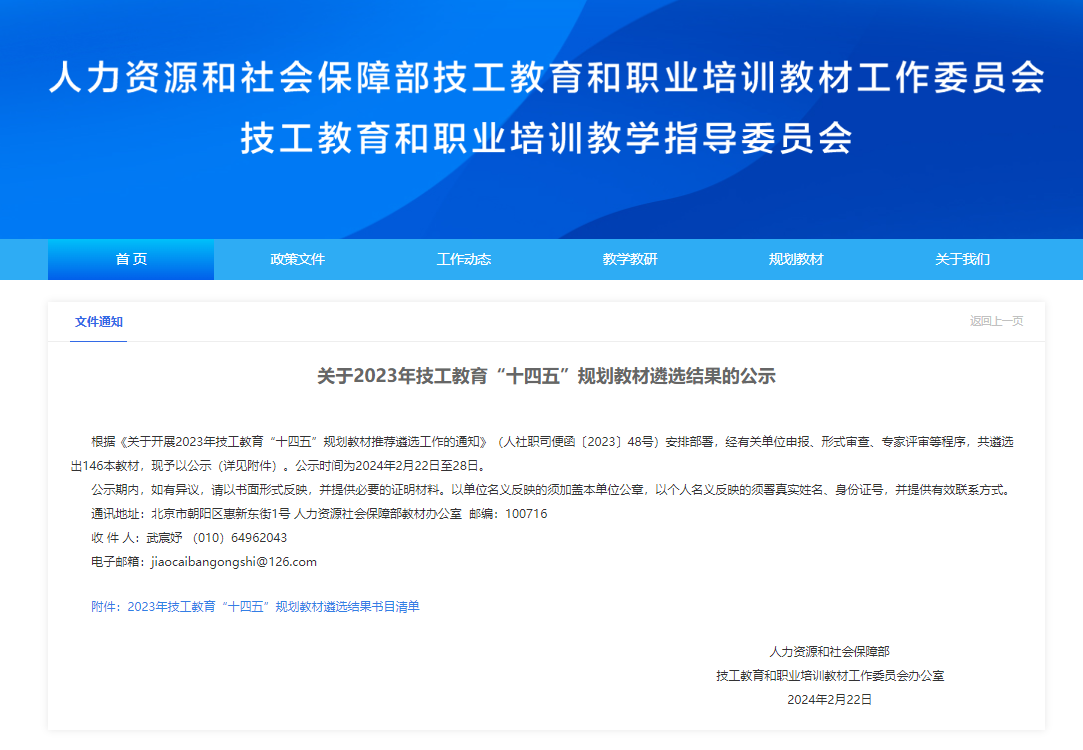 近日,人力资源和社会保障部技工教育和职业培训教材工作委员会公布了2023年技工教…