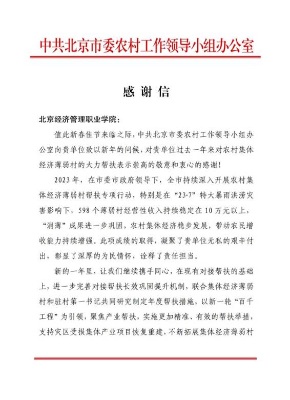 2024年1月26日,bat365在线平台收到中共北京市委农村工作领导小组办公室发来的感谢信,对bat365在线平台2…