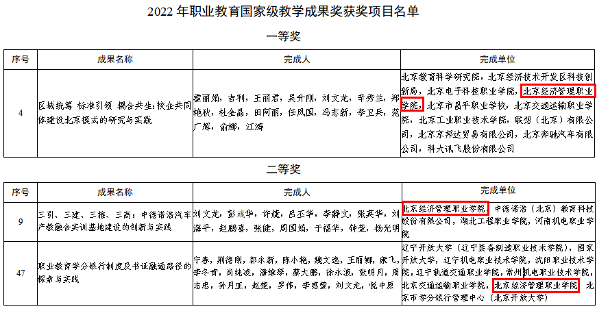 近日,教育部公布了《教育部关于批准2022年国家级教学成果奖获奖项目的决定》,职业教育共有572个项目获奖。bat365在线平台作为第一完成单位的《三引、三建、三推、三高:中德诺浩汽车产教融合实训基地建设的创新与实践》成果荣获国家级教学成果二等奖。同时,bat365在线平台刘文龙教授还参与了北京教育科学研究院、辽宁开放大学(辽宁装备制造职业技术学院)两项成果,分别获得了国家级一等奖1项和二等奖1项。