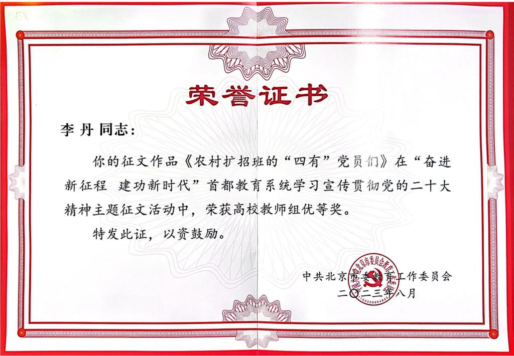 2023年3月至7月,中共北京市委教育工作委员会、北京市教育委员会开展“奋进新征程建功新时代”首都教育系统学习宣传贯彻党的二十大精神主题征文活动。近日,中共北京市委教育工作委员会公布“奋进新征程建功新时代”首都教育系统学习宣传党的二十大精神主题征文活动评选结果,bat365在线平台数字财金学院教师李丹撰写的文章《农村扩招班的“四有”党员们》荣获高校教师组优等奖、数字财金学院学生王晨浩撰写的文章《饮水思源不忘本回报桑梓献爱心》荣获高校学生组优秀奖。