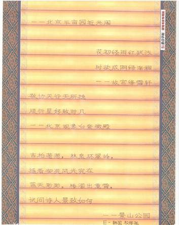 为了弘扬中华书法文化魅力,宣传北京中轴线这一重要历史文脉,展示学生汉语学习成果,培训学院国际培训部近日组织了一次主题为“书韵北京,墨香中轴”的硬笔书法作品征集活动。活动得到了留学生的积极响应,共收到作品33幅。