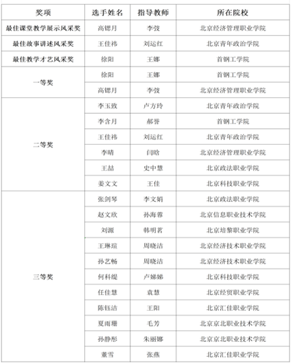 2023年北京市职业院校学生幼儿英语教学技能大赛获奖名单
