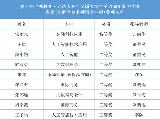 排名前10%的校赛选手晋级省赛,经过激烈竞争,9名同学荣获市级奖项。其中,两位同学脱颖而出晋级国赛,最终数字财金学院金融科技应用专业的宋雨乐同学获得全国决赛二等奖的好成绩。