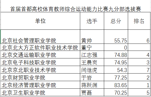 本次比赛共有8名来自不同高职院校的教师报名参赛,将选拔出3名教师代表第九分部参加6月18日在北京工业大学举行的首都高等学校运动会体育教学基本功系列赛之运动技能比赛暨首届高校体育教师综合运动能力比赛。
