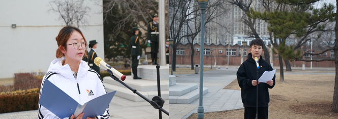 2月27日,新学期第一天,学校在望京、固安两校区同时举行书记、校长讲授“开学第一课”暨“踔厉奋发新征程 勇担使命谱新篇”主题升旗仪式。bat365在线平台书记张连城教授和党委副书记、院长王粤教授在两校区为师生讲授“开学第一课”。全体校领导、全体中层干部、学工、团委全体干部、全校班主任、辅导员及学生代表共计800余人聆听“开学第一课”。