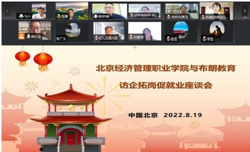 为了充分践行“书记校长访企拓岗促就业专项行动”,8月19日学校副院长李永生带队在线上与布朗教育集团开展了访企拓岗专项调研活动。布朗教育董事长助理程军锋、运营督导部总监刘春丽、人力资源总监武景花、井德润泽幼儿园长张颖,学校外语与学前教育学院领导班子及应用英语教研室全体教师参加了调研活动。