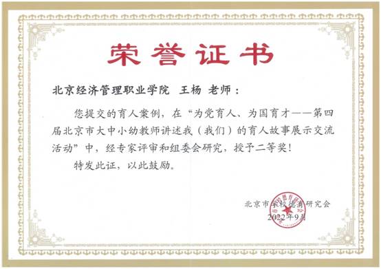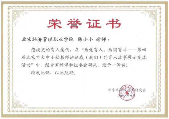 在第38个教师节前夕,9月3日,由北京市委教育工委、市教委主办,市学校德育研究会承办的第四届北京市大中小幼教师讲述我(我们)的育人故事展示交流活动成功举办,并为“为党育人,为国育才——第四届北京市大中小幼教师讲述我(我们)的育人故事展示交流活动”获奖教师颁发荣誉证书。bat365在线平台选送的陈小小的育人故事《做守护花开的人》荣获一等奖,王杨的育人故事《笔墨写春秋 匠心致传承》荣获二等奖。bat365在线平台是北京获得一等奖和二等奖的两所高职院校之一。