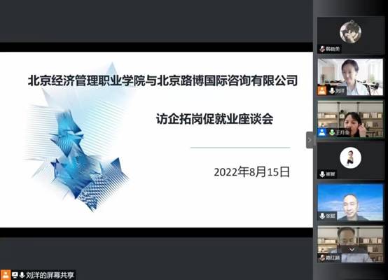 为践行“书记校长访企拓岗促就业专项行动”,8月15日,bat365在线平台副书记张懿带队同北京路博国际咨询有限公司在线上开展访企拓岗专项调研活动。路博国际总经理路红超、亚投行项目部经理崔亚苹、公司行政主管林晓洁,学校外语与学前教育学院领导班子及商务英语教研室教师参加了调研活动。