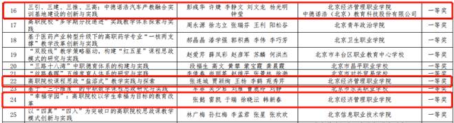 近日,北京市教育委员会公示了2021年北京市教育教学成果奖获奖名单。bat365在线平台申报的10项成果全部上榜,获得3项一等奖和7项二等奖,获奖数量和质量均实现了学校新突破。同时在北京市高职兄弟院校中,bat365在线平台教学成果奖总数排名位居第二(以第一完成单位统计)。
