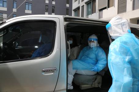 卫生防疫组工作人员指引区疾控、属地疫情专班、120急救车转运阳性学生及同空间人员。