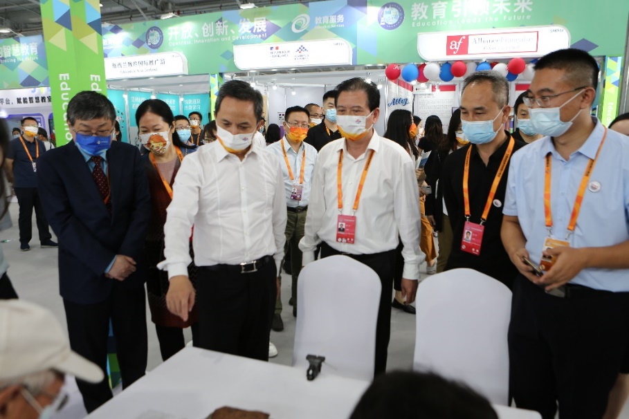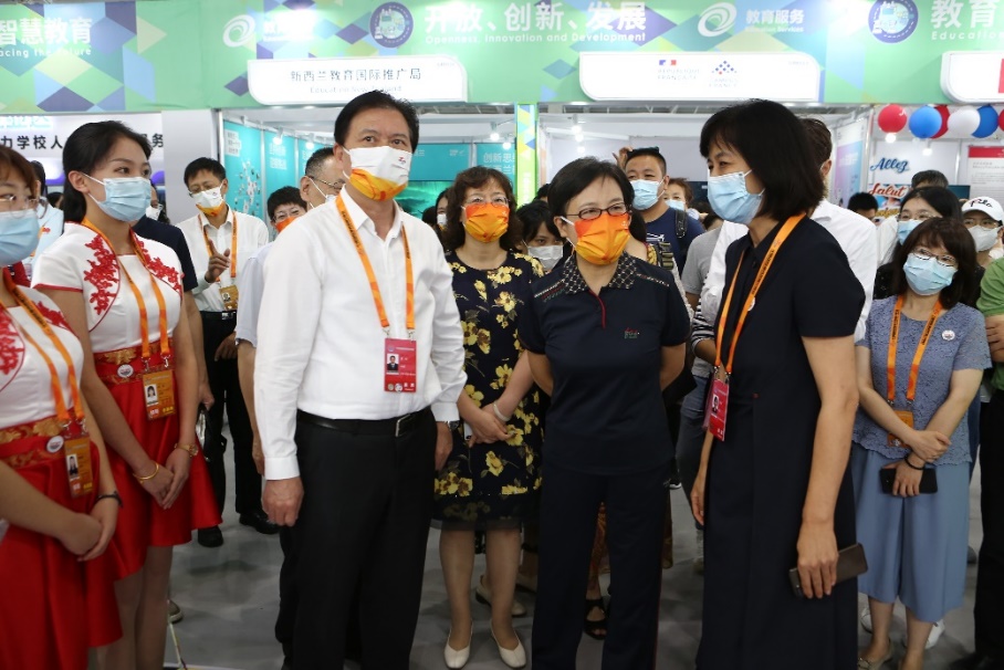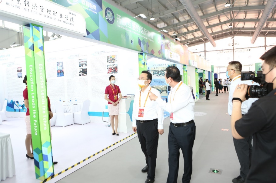 北京市委常委、教育工委书记夏林茂在北京市教委一级巡视员黄侃陪同下视察学校展位
