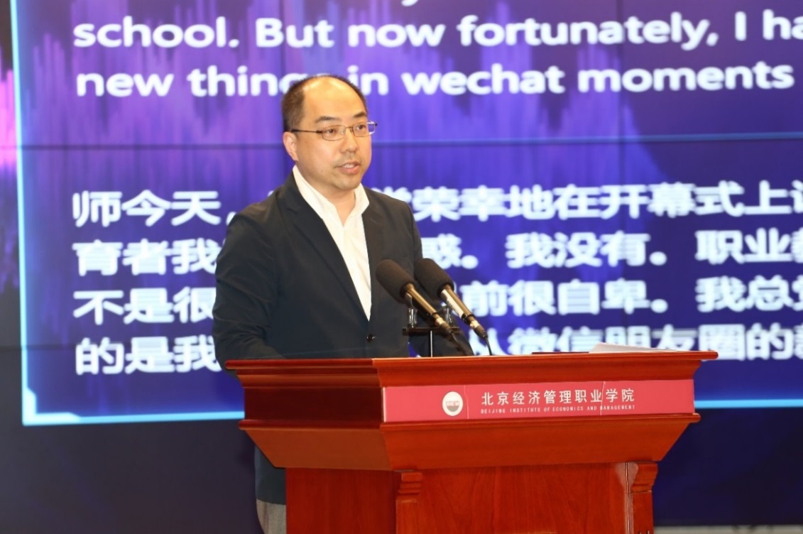 学校“双师型”教师代表、外国语学院教师闫晗用流利的英语以科大讯飞同声传译的方式做了题为《数字技能,使职业教育更出彩》的精彩演讲。