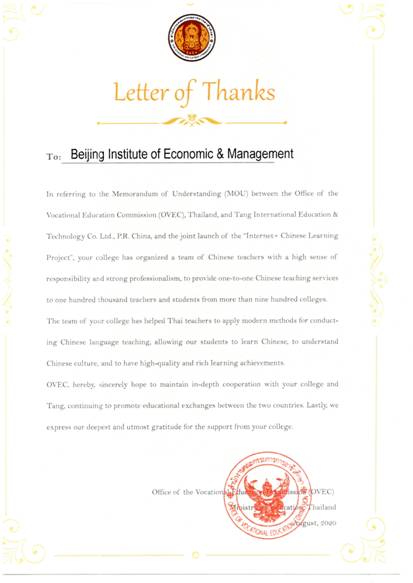 2020年5月,为支援泰国教育部疫情期间线上汉语教学,bat365在线平台国际教育学院派出赵蓉、陈峥、于英华、杨霞4名教师,分别为泰国锡雄职业技术学院、民武里技术学院、披迈科技学院的227名学生进行了为期三个月的远程在线教学,受到泰国师生的一致好评。为此,泰国教育部职业教育委员向bat365在线平台发来了感谢函。