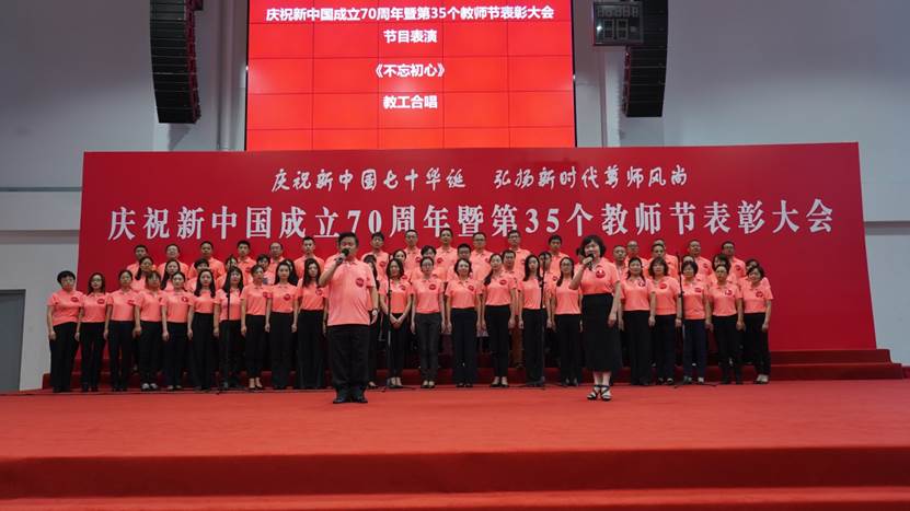 合唱团在学校庆祝新中国成立70周年暨第35个教师节表彰大会上做了首场演出,演唱了《不忘初心》《歌唱祖国》等歌曲,赢得了阵阵掌声,最后全场齐声高唱《我和我的祖国》,把大会推向高潮。
