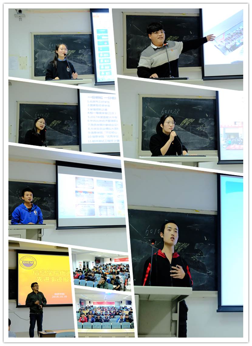 为了进一步发挥榜样的示范引导作用,更好地帮助新同学们规划三年的大学生活,作为引航工程系列活动之重要内容,信息学院于10月18日在3号楼109室举办了优秀学生先进事迹报告会,6名在学习、工作、实践等多方面表现突出的同学分享了他们的成长经历,2018级全体新生参加了报告会,并从中找到自己努力的方向和目标。报告会由辅导员王杰主持。