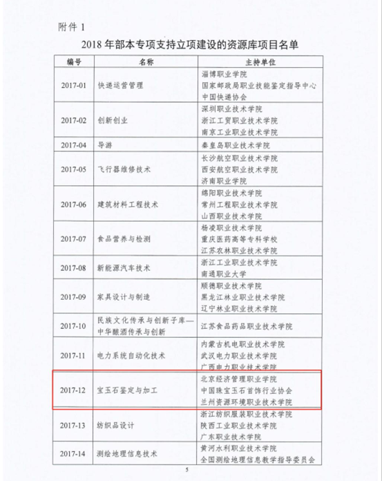 7月6日,教育部发布了《关于公布2018年职业教育专业教学资源库立项建设项目名单的通知》(教职成司函〔2018〕92号)。由bat365在线平台作为第一主持单位,联合中国珠宝玉石首饰行业协会和兰州资源环境职业技术学院共同主持,13家全国一流职业院校、10家国内知名企业共同申报建设的“宝玉石鉴定与加工专业教学资源库”成功入选2018年国家职业教育专业教学资源库(立项编号:2017-12)。