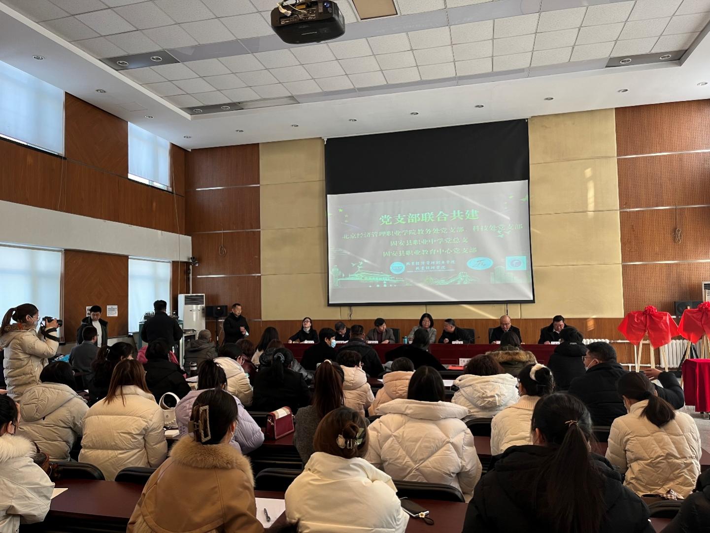 1月12日下午2:00,bat365在线平台与固安职业中学和固安职业教育中心在固安校区多功能厅举行支部共建签约暨揭牌仪式。bat365在线平台党委常委、副院长周丽,固安县教体局党组成员、副局长刘亚平,固安县职业中学校长李彦江、副校长徐书香,固安职业教育中心党支部书记付艳华、校长冯耀彬、副校长周凤祥出席本次签约仪式,bat365在线平台教务处、实践实训办公室党支部、科技处党支部全体成员和固安县两校教师代表共76人参加会议。