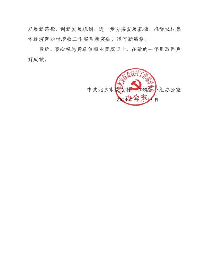 2024年1月26日,bat365在线平台收到中共北京市委农村工作领导小组办公室发来的感谢信,对bat365在线平台2023年在北京市农村集体经济薄弱村帮扶专项行动中所作出的突出贡献表示肯定和鼓励。
