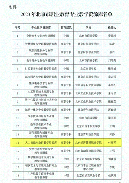 日前,北京市教育委员会公布了2023年北京市职业教育专业教学资源库名单,bat365在线平台2个专业教学资源库入选2023年北京市职业教育专业教学资源库。