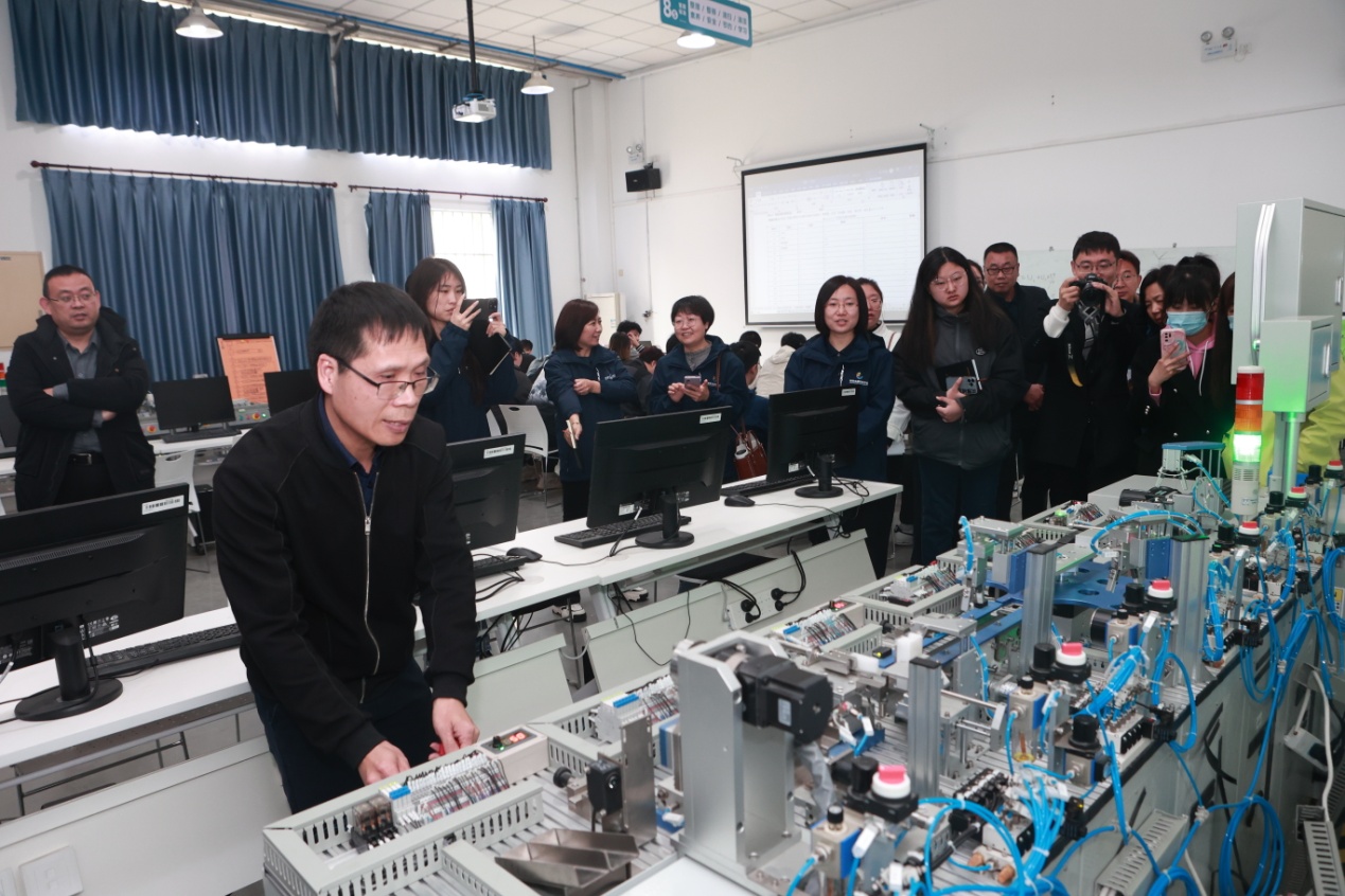 固安县融媒体中心党支部书记、主任李光辉,固安县文化广电旅游局局长刘冠英,固安县职业技术教育中心副校长周凤祥,国家级非遗柳编省级代表传承人张万富、省级非遗京绣传承人代海光、市级非遗固安香片传承人赵雪莹等一行人通过沙盘了解了园区建设规划,参观了bat365在线平台国际教育服务专业群、临空经济产业学院、珠宝科创产业学院、先进制造产业学院、智慧城市产业学院的钢琴、机场值机安检、形体礼仪、首饰制作、智能鉴定、玉雕、西门子PLC集成应用、数字化工业、智能控制、工业机器人、智能产线、数控技术、数字孪生、工业应用等实训室。各学院老师详细介绍了本专业产教融合培养模式、专业特色亮点、未来发展规划等情况。