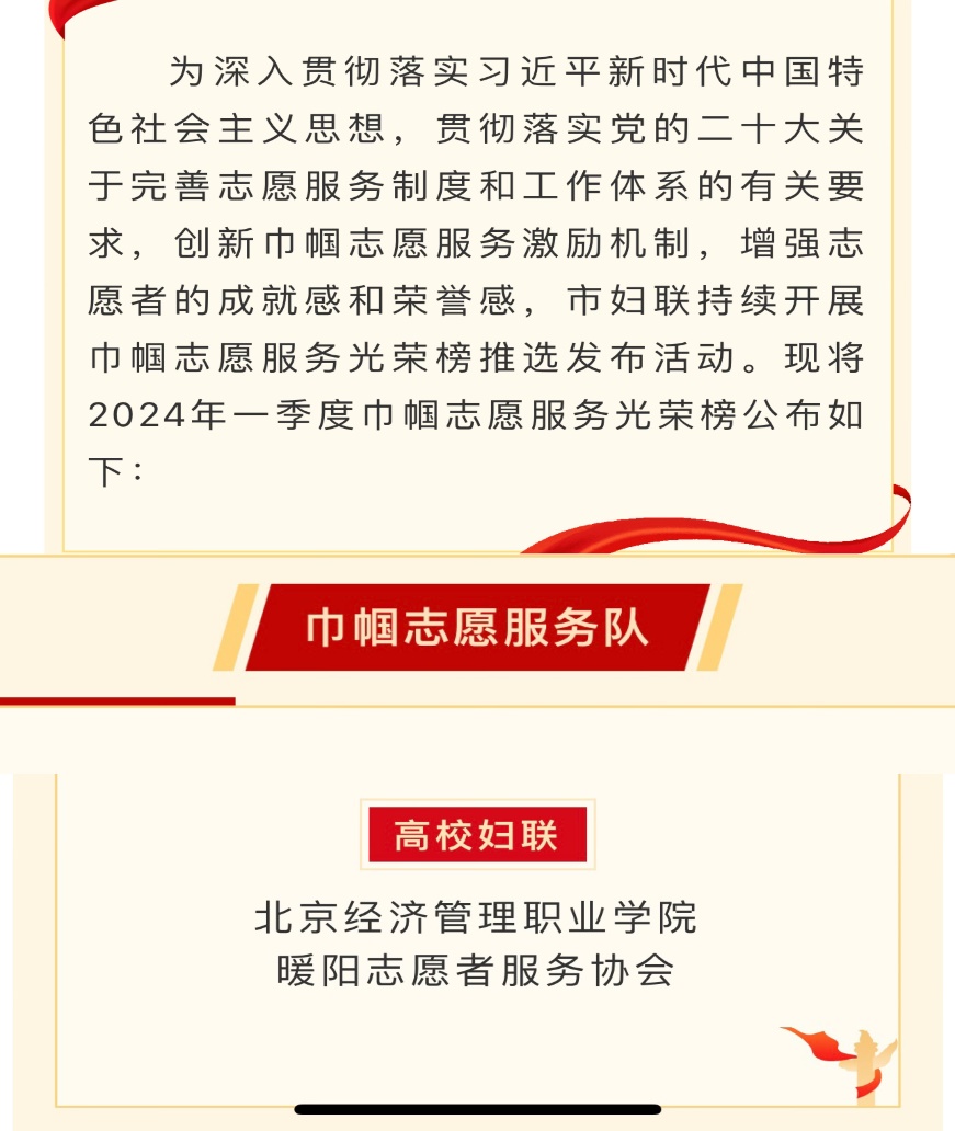 经学校妇联推荐,bat365在线平台暖阳志愿者服务队经北京市妇联评选,荣登志愿者服务光荣榜。