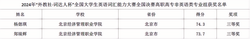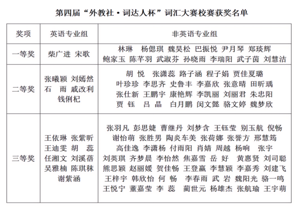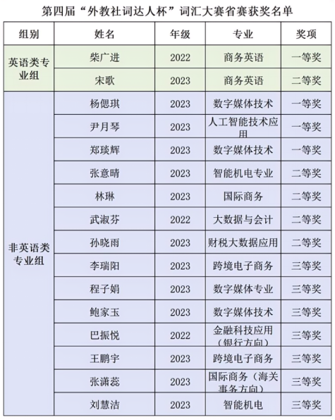 2024年3月至5月,外语与学前教育学院顺利承办了第四届“外教社•词达人杯”全国大学生英语词汇能力大赛。大赛历时2个多月,吸引了全校350余名学生踊跃参加。经校赛、省赛、国赛三轮比赛的激烈角逐,约100名选手获得校级奖项,其中16名选手获市级奖项,2023级数字媒体技术专业的杨偲琪、郑琰辉两位同学荣获全国决赛三等奖的好成绩。