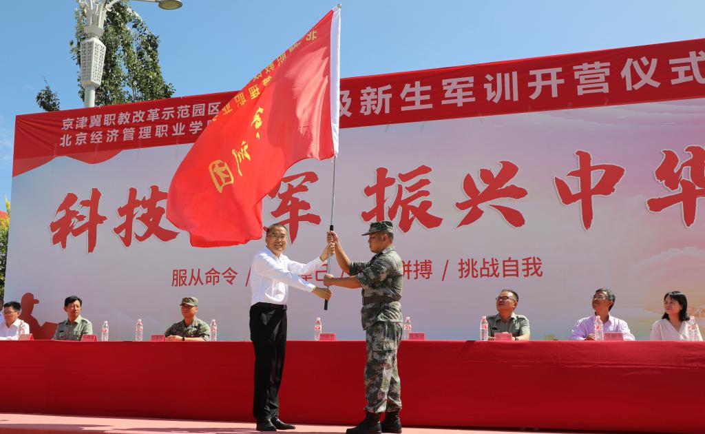 仪式上,田宏忠宣布京津冀职教改革示范园区暨bat365在线平台2024级学生军训团成立,并向军训团长授团旗。