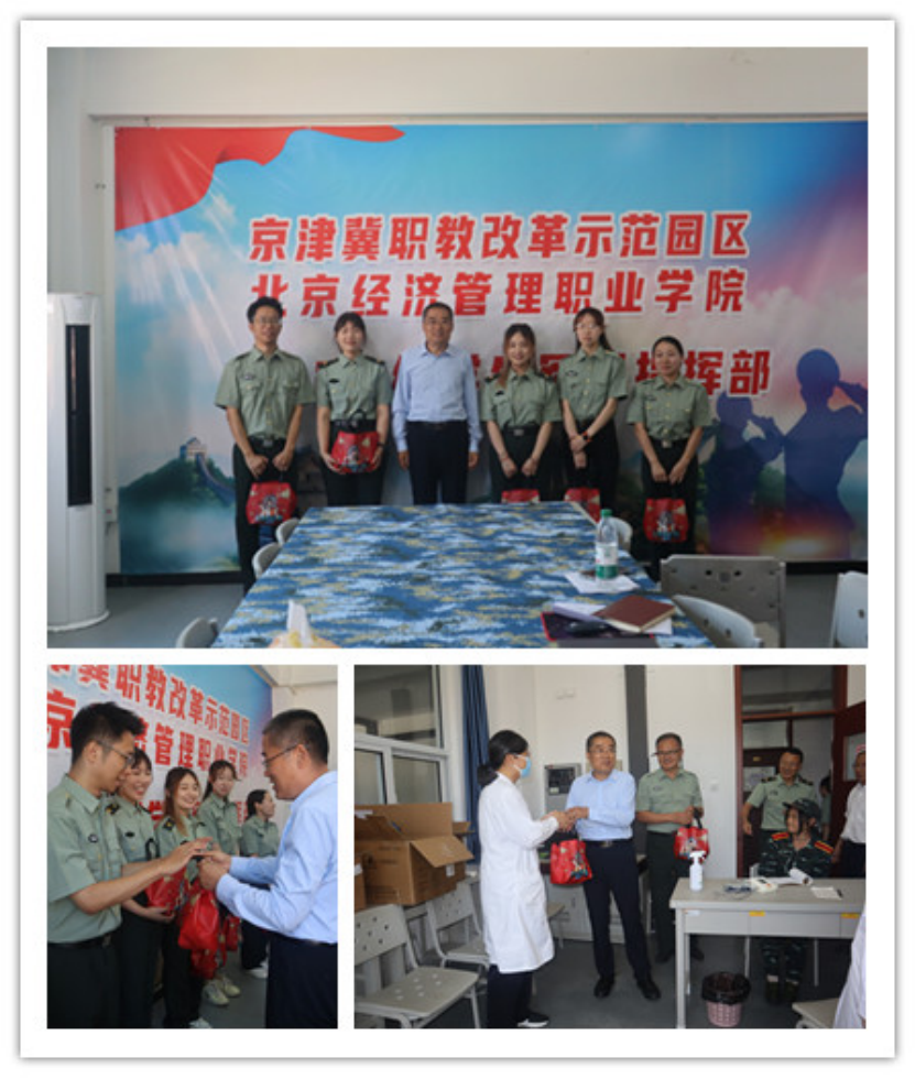 田宏忠来到医务室,同出诊大夫详细了解学生就医和身体状况,并代表学校送上了慰问品。在军训团团部,他向辅导员代表发放了慰问品,并同参训教师代表座谈交流。