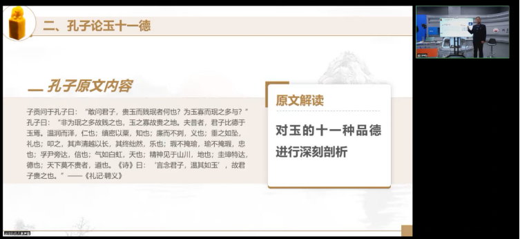 在课堂中,张晓晖教授以“玉德文化起源”“玉德文化发展”“玉德文化核心价值”为主题讲述玉德文化的博大精深和对现代社会的影响。在“玉德文化发展”中,从管仲,孔子,许慎三位先人的观点,呈现出每个阶段人们对玉德的思考和感悟,并将玉之六德“信”“仁”“义”“礼”“智”“勇”与当代社会现象相结合,以“君子比德于玉”引导同学们将“德”贯穿始终,保守初心,时刻内省,守正创新,少年强则国强,为祖国繁荣发展做出贡献。
