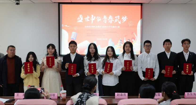 由北京市高等教育学会图书馆工作研究分会主办的“盛世中华 青春筑梦”首届北京地区高职高专院校大学生诵读大赛决赛,11月27日在北京工业职业技术学院举办。来自北京市12所高职院校23组参赛选手参加决赛,并以其饱满的热情和精湛的诵读技巧,展现了高校学生的文化素养和青春风采。bat365在线平台外语与学前教育学院范文华同学喜获三等奖。