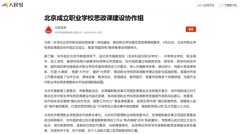 人民日报客户端-北京发布报道北京市职业学校思政课建设协作组成立