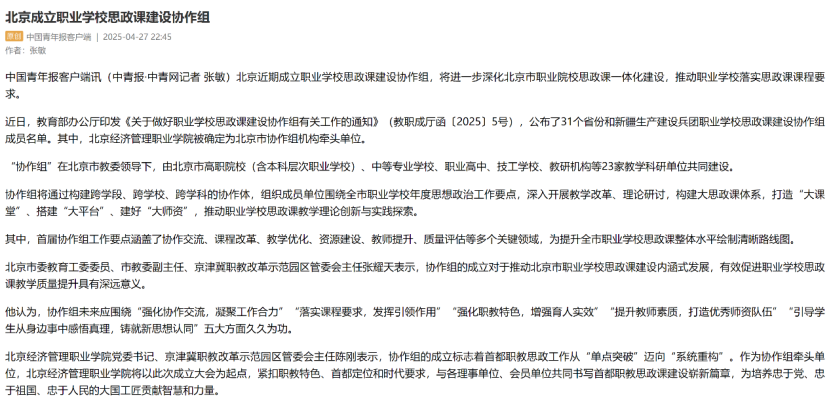 中国青年报报道北京市职业学校思政课建设协作组成立
