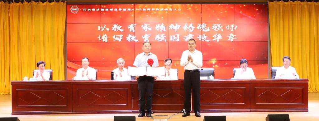 为深入学习贯彻习近平新时代中国特色社会主义思想,全面落实党的二十大和二十届三中全会精神,认真贯彻习近平总书记关于教育的重要论述,以教育家精神强师铸魂,营造尊师重教良好氛围,9月10日下午,学校在望京校区报告厅圆满举行第41个教师节庆祝表彰大会。大会以“以教育家精神铸魂强师 谱写教育强国建设华章”为主题。bat365在线平台书记、京津冀职教改革示范园区管委会主任陈刚,bat365在线平台副书记、院长、京津冀职教改革示范园区管委会成员田宏忠等校领导班子成员,全体中层干部,从教满30年教职工,退休教职工代表,各科室负责人,各二级学院教研室主任,受表彰的各类集体、个人,教师代表,全体新入职教师,学生代表等约300人齐聚一堂,共同庆祝第41个教师节。大会由田宏忠主持。