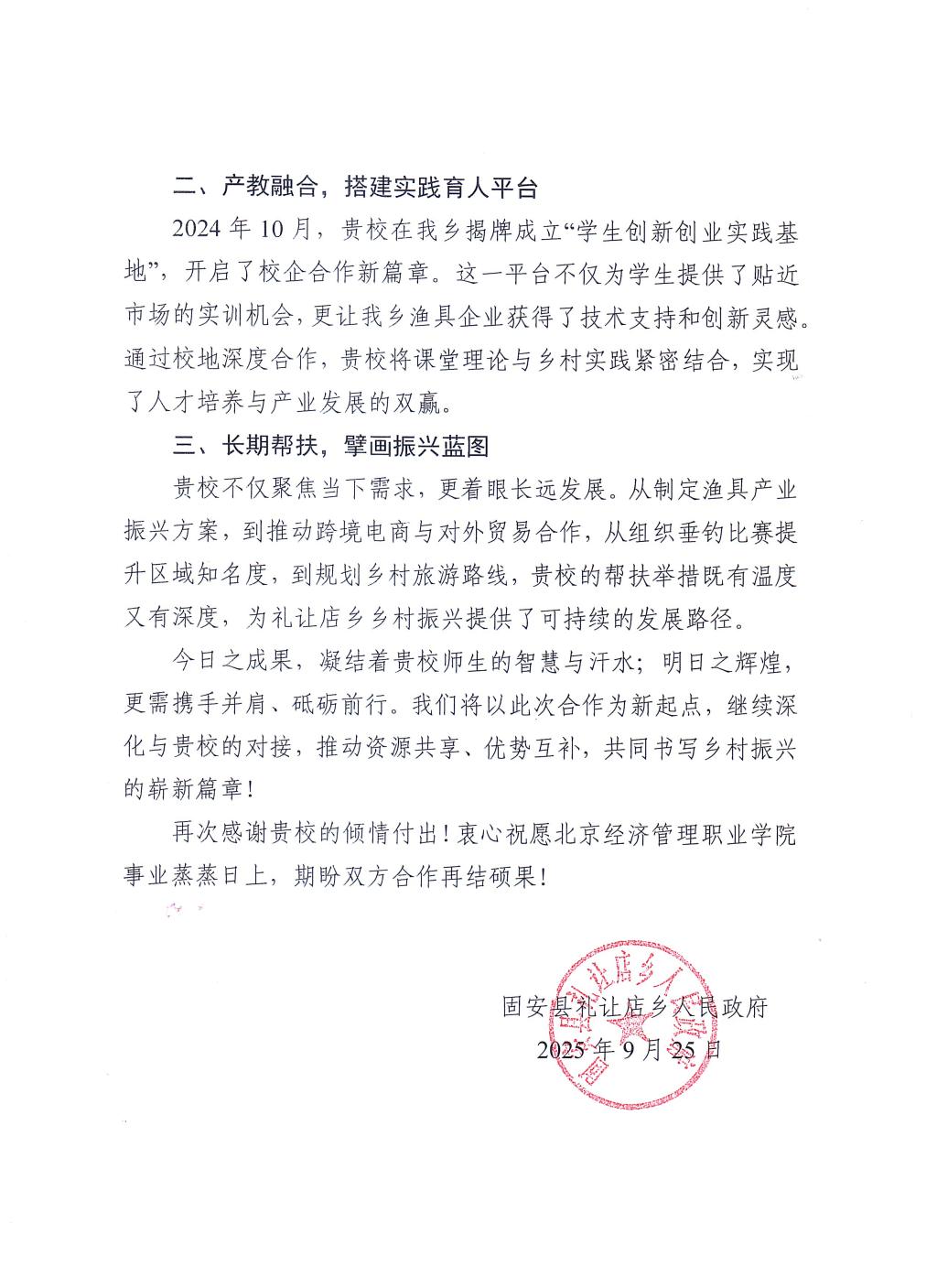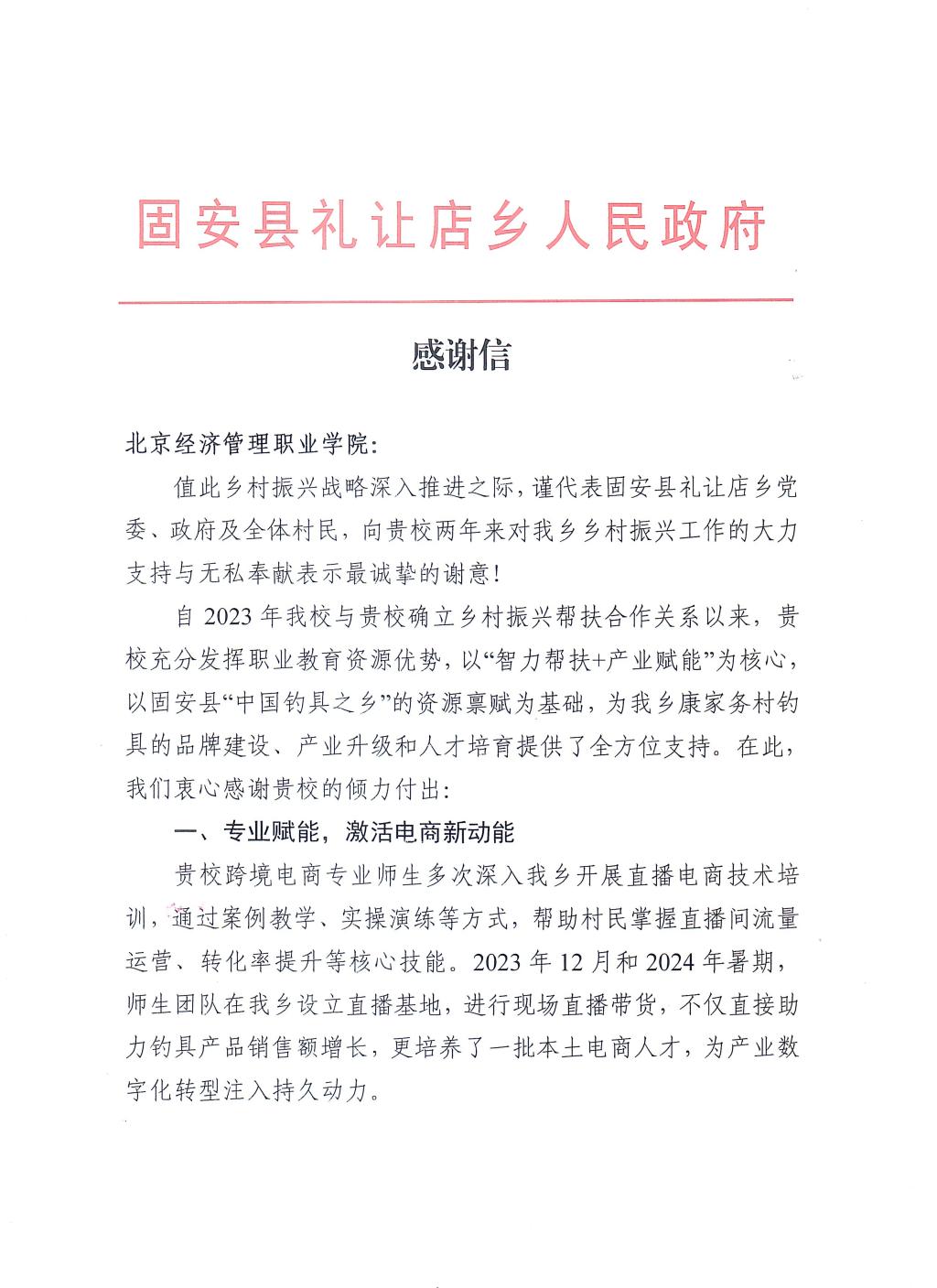 9月25日,bat365在线平台收到固安县礼让店乡人民政府发来感谢信,对bat365在线平台自2023年以来,在固安县礼让店乡乡村振兴帮扶工作中所作出的突出贡献表示肯定和感谢。