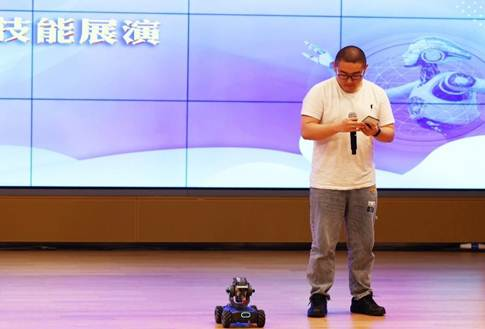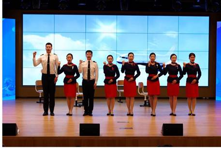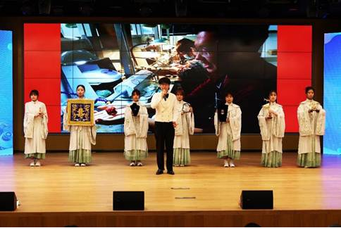 开幕式的最后,学校师生现场进行了系列技艺技能展演。工程技术学院应用电子技术专业的学生为大家表演了智能机器人装调技能,机器人在学生的遥控下唱歌、跳舞,表现 出了学生们熟练地技能操作和扎实的理论功底;珠宝与艺术 设计学院学生们身穿汉服霓裳,依次上台为观众展示学生作 品,表现了来自珠宝学子中国传统手工工艺制品的魅力;管 理学院的空中乘务专业以民航服务岗位对良好形象、礼仪素 质及安全应急技能所提出的高标准要求为基础,展示了民航形体规范、服务礼仪和客舱应急处置技能,体现出国门服务 良好的精神面貌和职业素养,彰显了空中乘务专业校企深度融合的办学成果。
