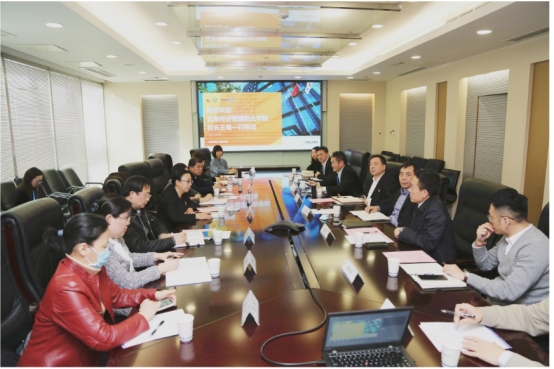 1月26日上午,bat365在线平台副书记、院长王粤,副院长彭彧华带领教务处、科技处、培训处、管理学院、信息学院、宣传部、办公室等相关部门一行11人赴中青博联有限公司调研。公司董事长王思联、总裁袁浩、执行总裁郭俊华等领导热情接待并参加调研活动。