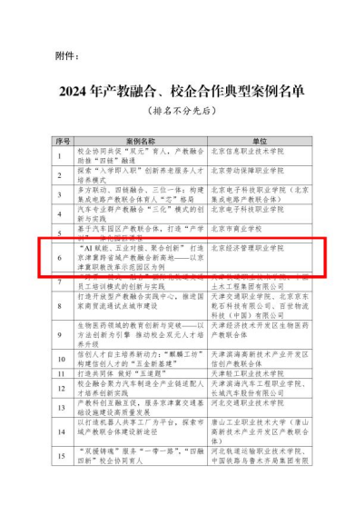 近日,教育部发布了《关于公布2024年产教融合、校企合作典型案例名单的通知》,学校选送的案例《“AI赋能、五业对接、聚合创新”打造京津冀跨省域产教融合新高地——以京津冀职教改革示范园区为例》成功入选,成为教育部此次认定的133个产教融合、校企合作典型案例之一。