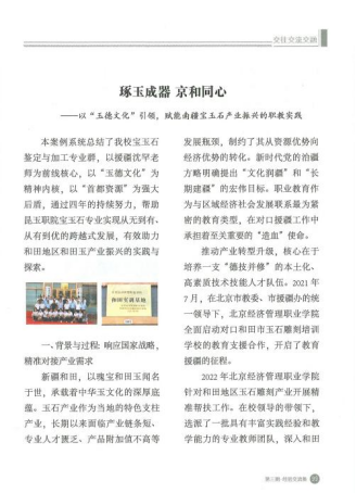 近日,由北京市支援合作中心组织编辑的《北京支援合作干部读本》正式出版,由学校产教融合办公室组织选送的珠宝与艺术设计学院案例《琢玉成器 京和同心——以“玉德文化”引领,赋能南疆宝玉石产业振兴的职教实践》成功入选,成为北京市教育支援合作领域的典型示范案例。该读本将印送全市支援合作工作领导小组成员单位及各地挂职干部,宣传推广。
